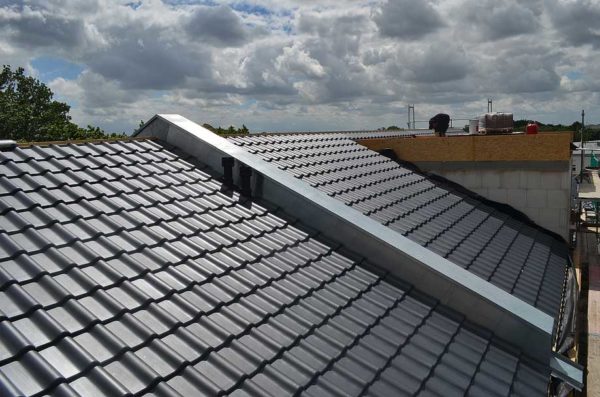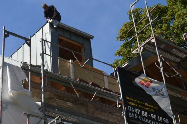 Dachsanierung, incl. Herstellung von Dachgauben • Dacheindeckung mit Tonziegel, Creaton Premion, Farbe: anthrazit engobiert • Dachentwässerung und Gauben (Stehfalztechnik) mit Rheinzink, Farbe: blaugrau vorbewittert • Dachflächenfenster, Rollläden Velux